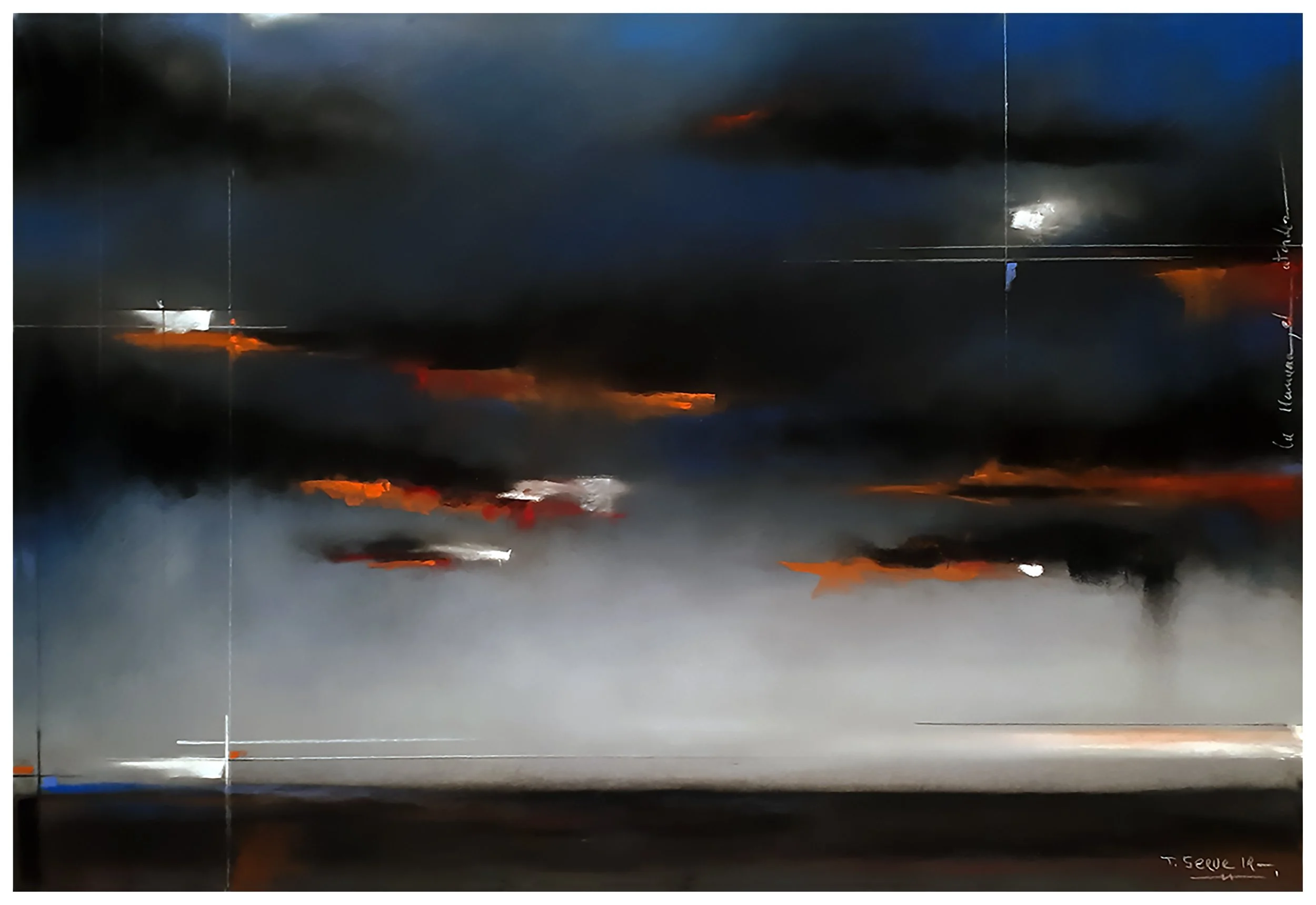 Teo Serna (Manzanares, 1954) es poeta y artista plástico. Trabaja con gran variedad de técnicas y ha realizado exposiciones tanto de pintura como de poesía visual. La serie en pastel que nos presenta está inspirada en el paisaje celeste de la Mancha.